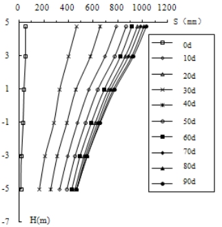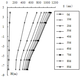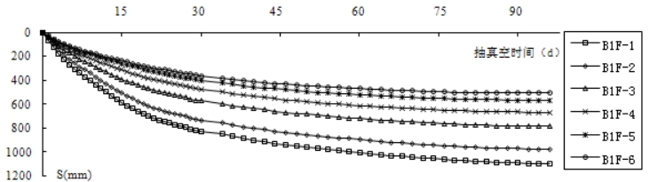由图6、图7可见,曲线下部较陡,上部较缓。这说明下卧淤泥质黏土压缩性较小,沉降比例较上部淤泥层小,且由于真空度沿深度的衰减,导致预压荷载减小所致。
