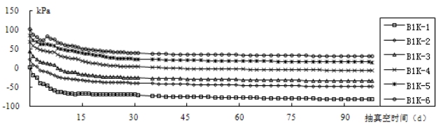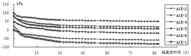 从不同深度孔隙水压力推算真空度,测点1~测点6埋深高程分别为+4.3m,+2.1m,-0.4m,-2.9m,-5.4m,-8.4m,A1区真空度分别为80kpa,79kpa,68kpa,65kpa,63kpa,50kpa,B1区真空度分别为85kpa,72kpa,78kpa,78kpa,70kpa,70kpa。这说明地基中真空度总体上沿深度方向呈衰减趋势。且可判断,本工程真空预压有效加固深度可达到13m以上。
