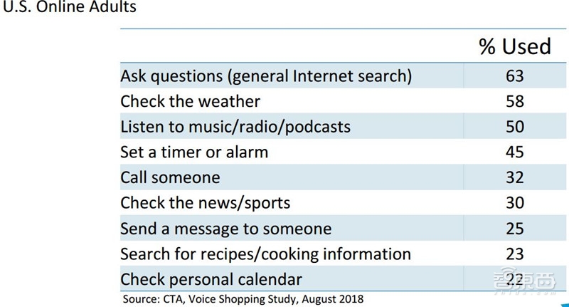 据研究,数字助理正在改变用户的行为。据统计,在美国互联网用户中,使用做多的功能是数字助理提出问题或进行互联网搜索,比例是63%;其次是用数字助理查看天气预报,有58%;50%的用户用数字助理听音乐/广播;45%的用户用数字助理设置闹铃;32%用数字助理打电话;30%的用户用数字助理浏览新闻;25%的用户用数字助理发信息;23%的用户用数字助理搜索菜谱;而22%的用户用数字助理查看个人日程安排。